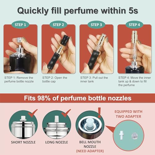 【FITS 98% OF PERFUME BOTTLE NOZZLES】- The package with two adapters which suitable for most perfume sprinklers in the current market, you can use them on your perfume bottle nozzle to efficiently fill the atomizer without any leaks or waste of perfume.