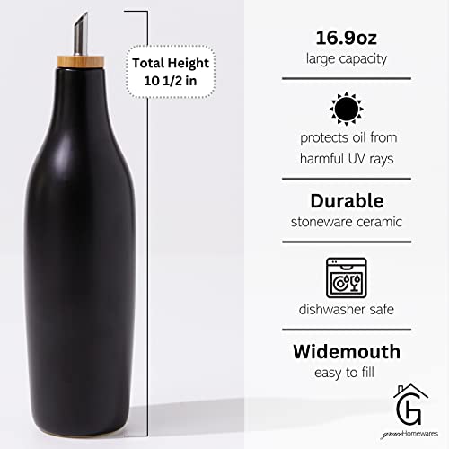 Grace Homewares Olive Oil Dispenser Bottle Stoneware Ceramic for EVOO or Vinegar | Modern Design | Large Capacity 16.9 ounce | Oil Container | Black